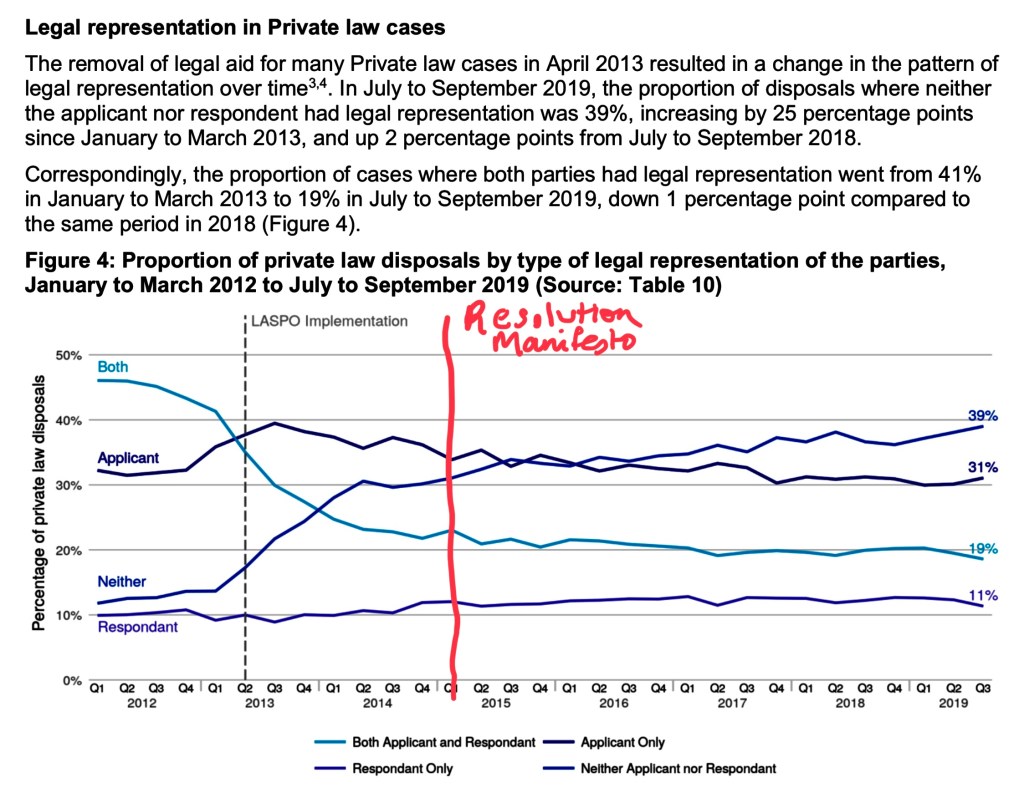 However, that doesn’t tell the whole story, as it doesn’t deal with the ending of unmarried parent relationships. We know that cohabiting couples are the fastest growing relationship type (around 3.4 million couples, having increased from 15.3% of all families to 17.9% in a decade and expected to double by 2032) and they are widely acknowledged to be a less stable form of union than marriage/civil partnerships. However stats for the ending of cohabiting relationships are hard to come by as there is no interaction with the state when a cohabiting relationship ends, save to the extent any financial orders are made for children or child arrangements orders.