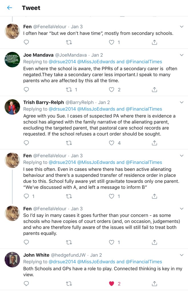 The other type of single parent is one where the other parent has been involved (or has had the chance to be involved) in a child’s life, but for a multitude of reasons associated with the present parent or the child (and often one drives the other) no longer is. I have seen both mums and dads as estranged parents, and both mums and dads occasionally playing a role in the estrangement. The common theme is the impact on the child concerned; and the plea is to consider how we may do things differently for children.