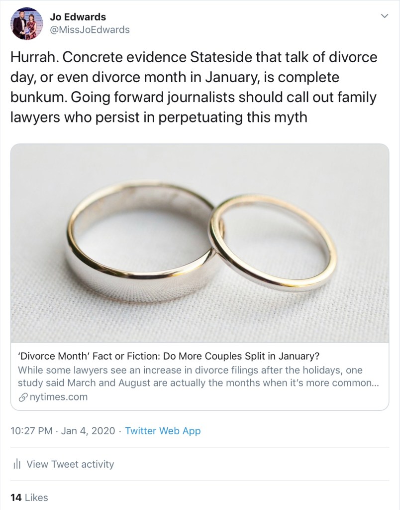 So what signal does it give those contemplating divorce, at their own or their spouse’s behest, if we continue to peddle the story that people are flocking in droves to end their marriages/to see a divorce lawyer on a particular day in January? Does it become a norm that drives people to make what can be a far-too-hasty decision, when my opening line to clients is always that the one thing I will never advise them on or pressurise about is whether and if so when to end their marriage, as that it such a life-changing, personal decision? And wouldn’t it reflect better on our profession, whilst acknowledging how hard Christmas and New Year can be for families in crisis, to point out that ALL marriages go through rocky patches and intensive counselling should precede hasty decisions? Only those who have already had that counselling, or for whom a marriage is in crisis due to domestic abuse, should be encouraged to start a legal process in January.
